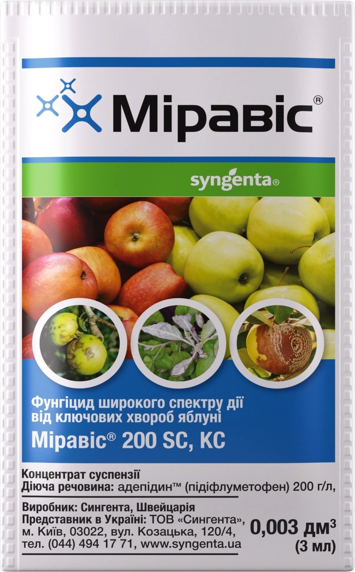 Фунгіцид Міравіс 3 мл, Syngenta – містить найновішу діючу речовину для захисту плодів від широкого спектру хвороб. Має унікальну тривалу профілактичну і захисну дії. Забезпечує високу якість урожаю в складних погодних умовах.