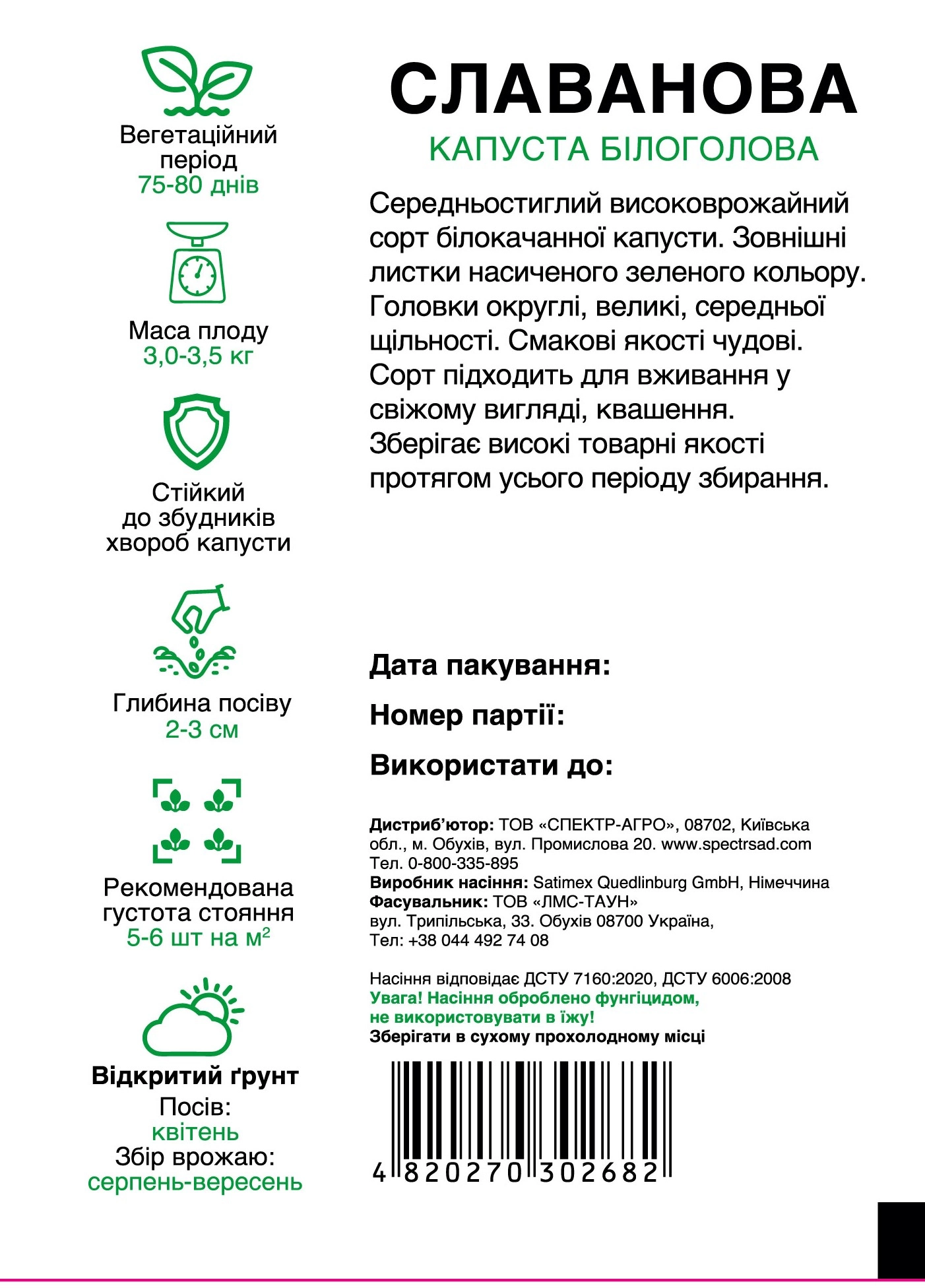 Збирання врожаю серпень-вересень. У полі зберігає високі товарні якості протягом усього періоду збирання. Вирощувати білокачанну капусту потрібно розсадним способом.