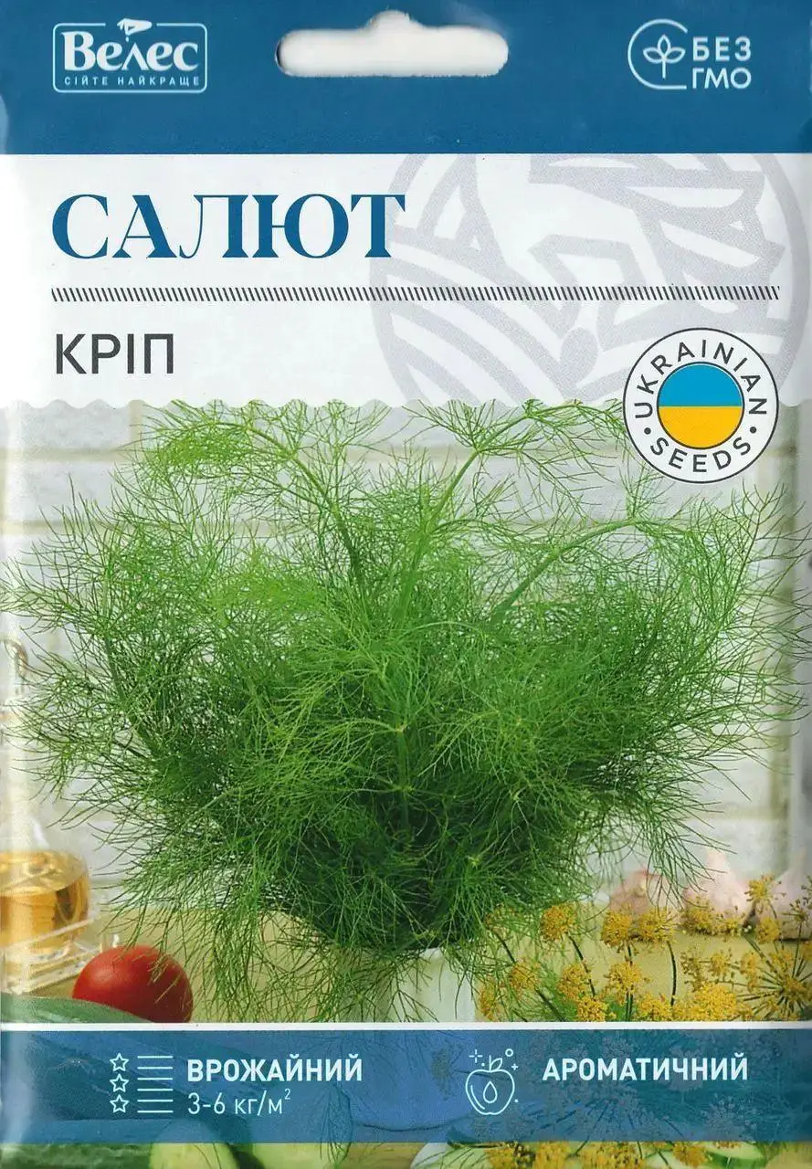 Насіння кропу Салют (кущовий) 20г Пізньостиглий сорт. Першу прибирання зелені проводять через 50-65 днів. Рослина кущова, висотою 45-55см, масою 70-100г. Листя великі, довжиною 12-16см, світло-зелені зі слабким восковим нальотом, відмінного смаку і аромату. Сорт цінується за повільне стеблування, що дозволяє продовжити термін господарської придатності. Використовують для споживання у свіжому вигляді, сушіння і при консервуванні.