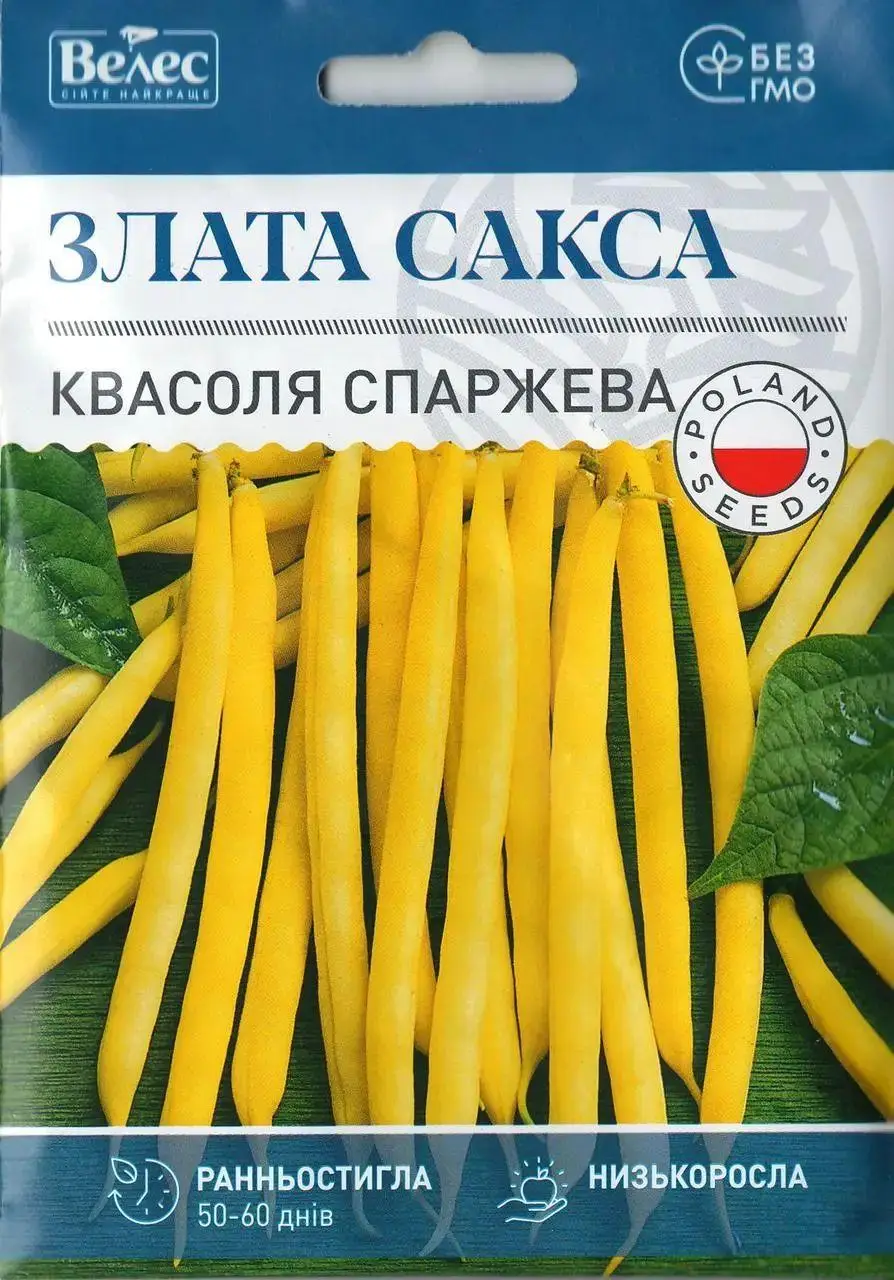 Квасоля Спаржева Злата Сакса 15 грам – спаржевый скоростиглий сорт. Плоди характеризуються приємними смаковими якостями і м’ясистою структурою. До першого зібрання стручків можна приступати вже через 50-60 днів після сходів. Кущ низькорослий, висотою 35-40 див. На одній рослині формується до 14 злегка зігнутих стручків, довжиною 10-12 см, шириною 8-9мм, золотистої забарвлення, без пергаментного шару і волокна. Смакові якості відмінні. Врожайнийсть дуже висока.