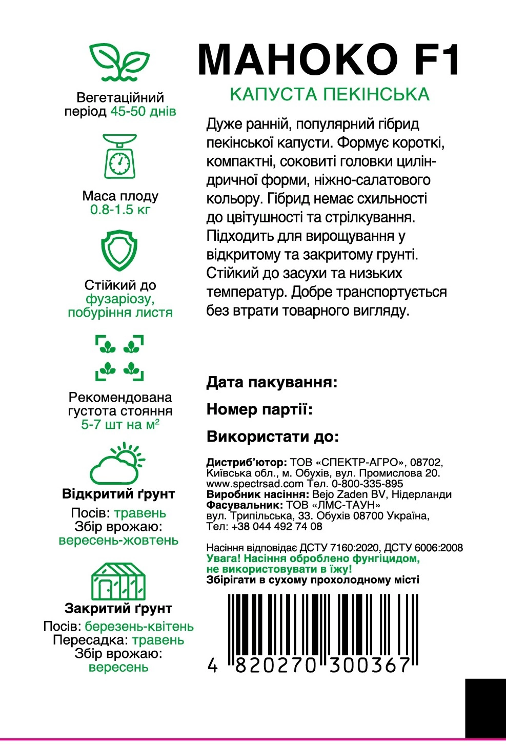 Маноко F1 – дуже ранній, популярний гібрид пекінської капусти. Формує короткі, компактні, соковиті головки циліндричної форми, ніжно-салатового кольору. Гібрид немає схильності до цвітушності та стрілкування. Підходить для вирощування у відкритому та закритому грунті. Стійкий до засухи та низьких температур. Добре транспортується без втрати товарного вигляду.