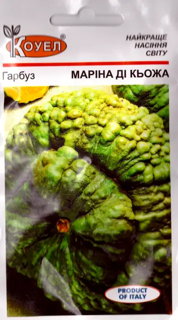Насіння гарбуза Марина ді кьожа 10шт Коуел. Старовинний, навіть стародавній сорт гарбуза з містечка Кьоджа в Італії, на узбережжі середземного моря. Також її називають Кьоджийская морська гарбуз, цей сорт вважається королем серед Італійських гарбузів. Унікальна форма гарбуза у вигляді тюрбана з пухирчастої поверхнею, тверда, міцна, зелено-блакитного кольору. М’якоть яскраво-помаранчева, суха, дуже солодка і якісна. Вага гарбузів 3-6 кг, обчыно на одній рослині зростає 2 плоду. Зберігається дуже добре, з часом смак гарбуза покращується! Гарбуз Марина ді Кьоджа мускатна, її солодкий смак не має терпкості, і в сирому вигляді її можна їсти просто як яблуко. М’якоть крохмалиста, смачна, ідеальна для приготування каш та інших страв. Плоди добре зберігаються до весни. При посадці в кінці травня плоди починають досягати технічної стиглості в кінці серпня. Максимальні примірники виростають до 10 кг. Рослини дуже енергійні, добре відгукуються на удобрений грунт і регулярний полив.