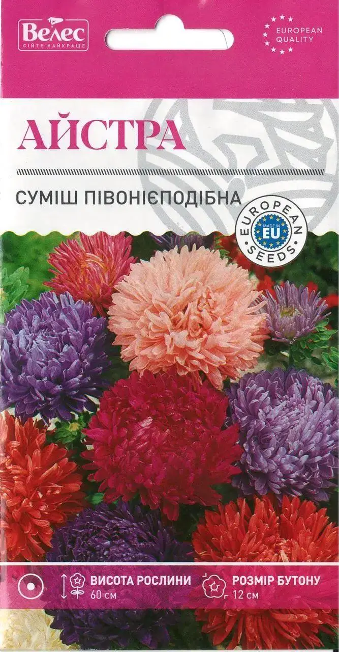 Насіння айстри суміш піоновидна 0,3 г Однорічна рослина. Кущ колоноподібний, висотою 50-70см. Квітконоси слабооблистнени, довжиною 35-50см. Суцвіття махрові, діаметром 8-12 см, різних забарвлень. На кущі формується до 30 суцвіть на гілках першого та другого порядку. Використовують для зрізу. При висіві насіння, слід пам’ятати, що насіння які проростає не витримує пересихання ґрунту, а також надлишок вологи та різкі коливання температури.