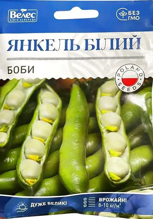 Насіння бобів Янкель білий 20г Середньоранній сорт. Вегетаційний період від сходів до технічної стиглості 90-100 днів. Рослина детермінантна, висотою 80-120 см. Стручки широкі, довжиною 12-15 см, містять 4-6 великих бобів, в молочно-воскової стиглості біло-зеленого кольору, а в біологічній стиглості бежевого. Смакові і товарні якості відмінні. Використовують боби для заморожування, переробки і консервування.