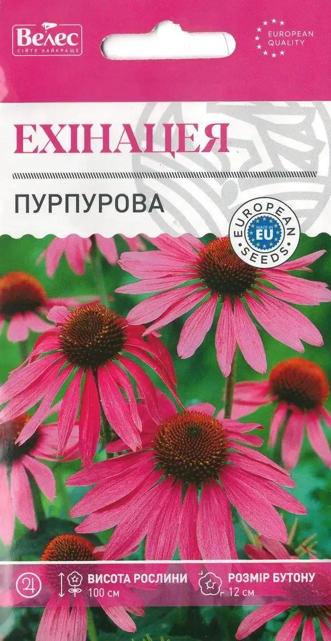 Насіння ехінацеї Пурпурна 0,5 г Багаторічна рослина. Стебла прямі, висотою 90-100см. Великі язичкові квітки, діаметром 10-12см, пурпурно-рожевого кольору.