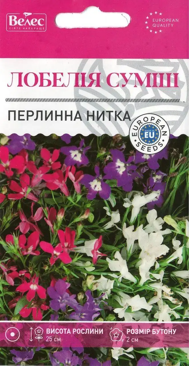 Лобелія Перлова нитка 0,10 грама – багаторічна рослина, що культивується як однорічна. Стебла тонкі, гіллясті, довжиною до 25 см. Квітки дрібні, діаметром до 2 см, рубіново-червоного, темно-блакитного, білого та фіолетового кольорів, під час цвітіння повністю покривають рослину. Насіння на розсаду висівають у горщики в березні-квітні і накривають склом або плівкою. Розсаду пересаджують у відкритий грунт в травні-червні. Цвіте рясно з червня по жовтень. Лобелія чудово виглядає висаджена групами в бордюрах, рабатках, на газонах і в садових вазах.
