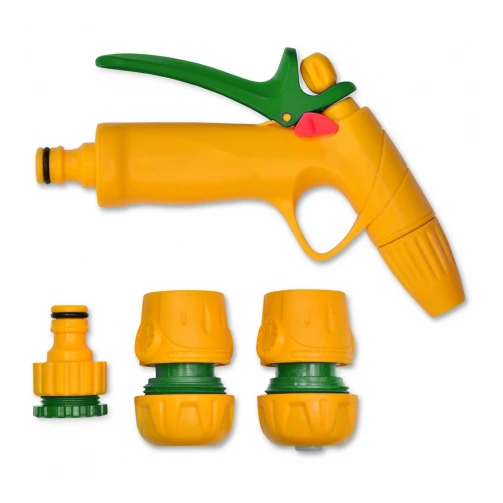 Готовий набір для поливу під шланг 3/4″. Комплектація: пістолет-розпилювач пластиковий ABS+PP регульований з фіксатором потоку, з’єднувач пластиковий 3/4″, з’єднувач з аквастопом пластиковий 3/4″, адаптер 1/2-3/4″ пластиковий. Пістолет використовується для ручного поливу газонів середньої та невеликої площі, городів, квітників, прибирання доріжок на прибудинковій території, миття садового інвентаря та техніки. Інструкція по підключенню пістолета: підключити садовий шланг через кран до джерела водопостачання за допомогою адаптера, за допомогою конектора з аквастопом підключити шланг до пістолета, вибрати необхідний режим поливу, включити пістолет натисканням на курок.