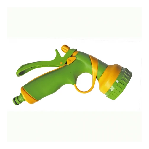 Пістолет з кнопковим фіксатором потоку. Ергономічна ручка з заглибинами під пальці. 8 режимів поливу: центр, конус, потік, туман, вертикальний, плоский, повний, душ. Зміна режиму роботи простим поворотом головки. Пістолет використовується для ручного поливу газонів середньої та невеликої площі, городів, квітників, прибирання доріжок на прибудинковій території, миття садового інвентарю та техніки. Підключається до садових шлангів за допомогою конекторів. Рекомендований робочий тиск в системі від 2 до 4 атмосфер. Виготовлений з якісного матеріалу ABS+PP+TPR, стійкий до механічних пошкоджень, впливу ультрафіолету і водорозчинних добрив. Інструкція по підключенню пістолета: підключити садовий шланг через кран до джерела водопостачання, за допомогою конектора (з аквастопом) підключити шланг до пістолета, вибрати необхідний режим поливу, увімкнути пістолет натисканням на курок.