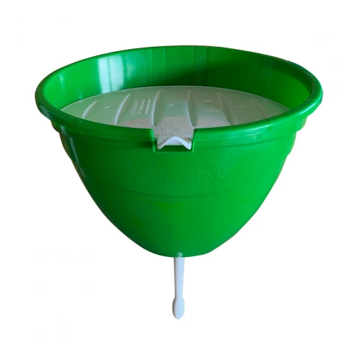 Рукомийник виготовлений з високоякісної пластмаси. Добре тримає воду та не протікає. Складається з трьох частин: конусоподібна ємність для води з отвором в дні, кришка з пазами та підйомний стрижень для регулювання потоку води. Пластикова кришка міцно прилягає та не дає бруду попасти у воду. Використовують для вмивання, миття рук, фруктів і овочів, посуду. Можна використовувати на дачі, на відпочинку та в місцях з обмеженим водопостачанням.