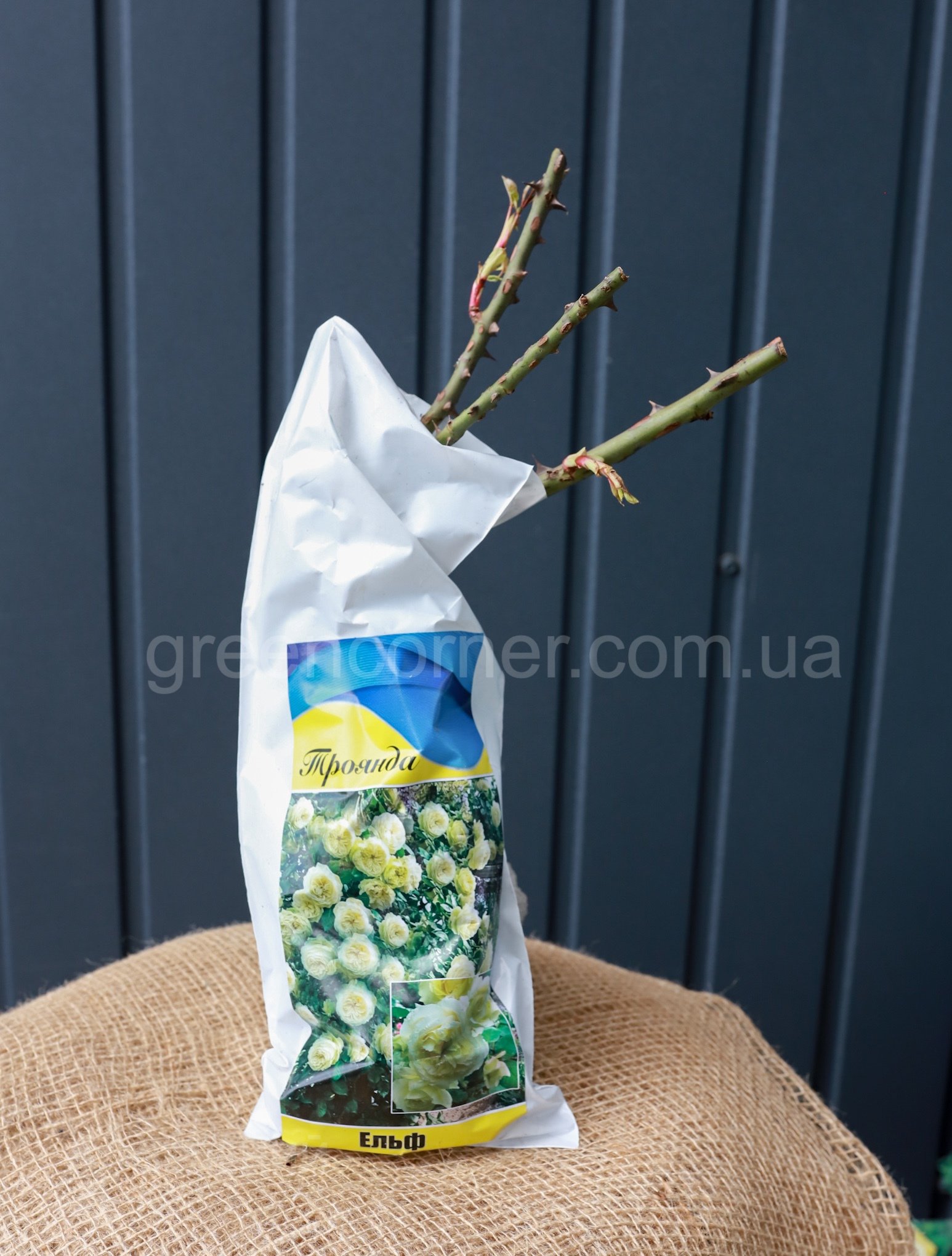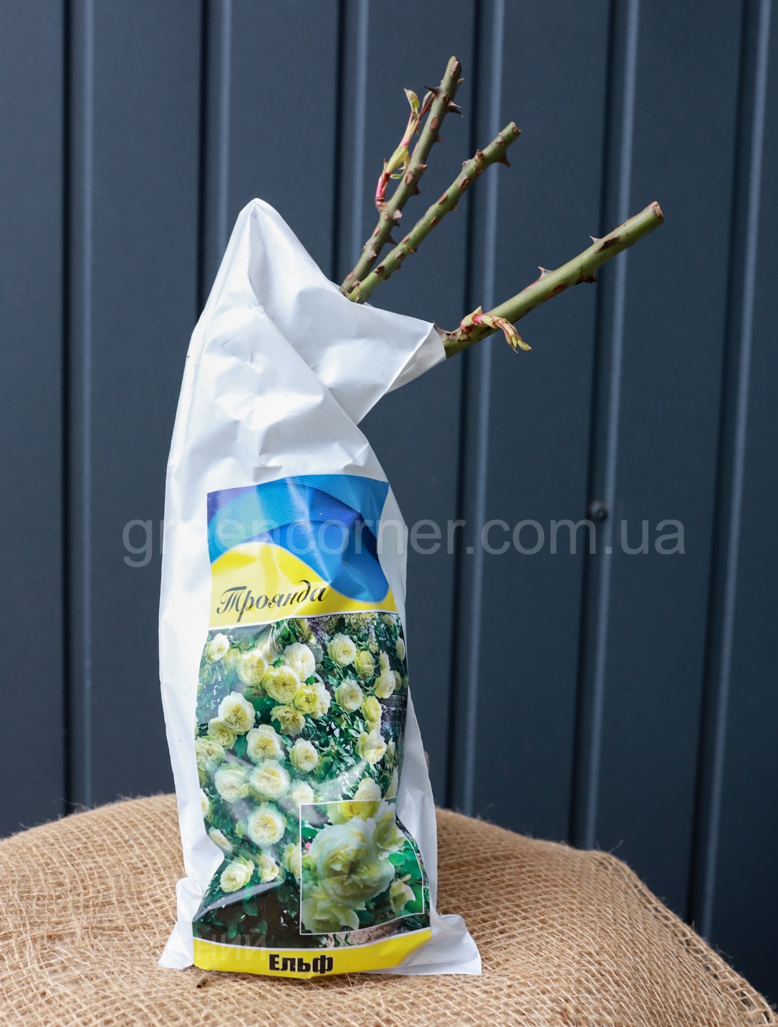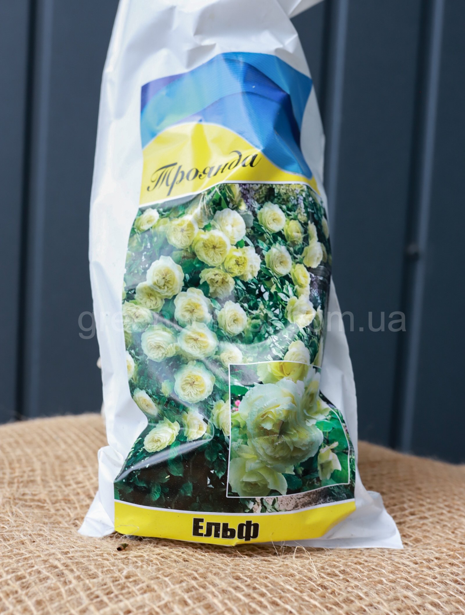 Шикарна плетиста троянда Ельф кольору слонової кістки з блідо-зеленим лимонним відтінком в основі пелюсток і з величезними ностальгічними квітками. Колір дуже рідкісний. Це дивовижна новинка серед плетистих троянд. Квіти у неї дуже великі, густо-махрові до 14 см. З такою трояндою сад може значно перетворитись. Це сорт особливого стилю!