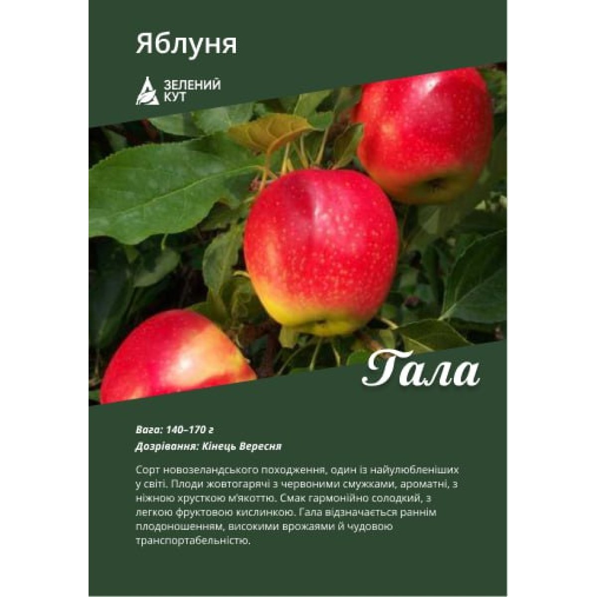 Яблуня Гала — популярний осінній сорт із високою врожайністю та чудовими смаковими якостями. Плоди середнього розміру (130–160 г), мають жовто-червоне забарвлення з яскравим рум’янцем. М’якоть соковита, хрумка, ароматна, зі солодким десертним смаком. Дозрівання — вересень, зберігаються до лютого, добре переносять транспортування. Дерево середньоросле, швидко вступає в плодоношення, стійке до парші й морозостійке. Ідеально підходить для свіжого споживання та продажу